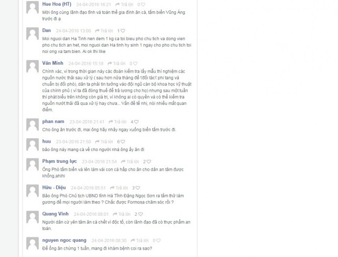 Hay như độc giả có nickname Biên Giới thẳng thắn góp ý: “Lấy toàn bộ cá ở vùng đó nấu cho Đoàn kiểm tra ăn thử, sau đó dẫn đoàn kiểm tra xuống biển Vũng Áng tắm mát!”. Như vậy có thể thấy, người dân rất mong mỏi được những người đứng đầu tỉnh Hà Tĩnh “làm gương” cho mình trước rồi lúc đó họ mới có thể “an tâm” làm theo.