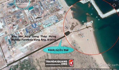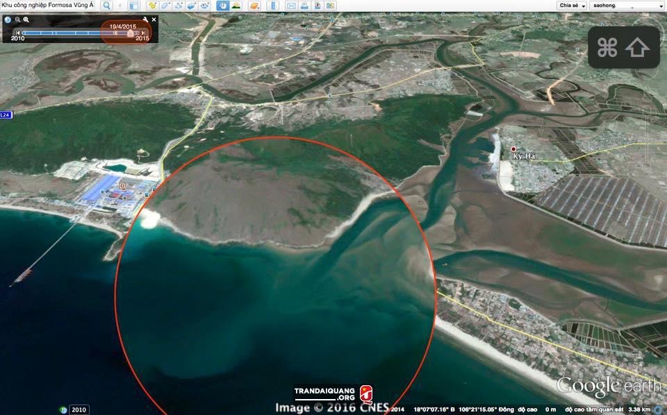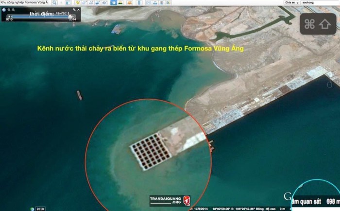 Ảnh chụp Google Earth thời điểm ngày 19/4/2015 ở độ cao 698m cho thấy, kênh nước thải chảy thẳng ra biển từ khu gang thép Formosa Vũng Áng (Ảnh FB Hào Song Trần)