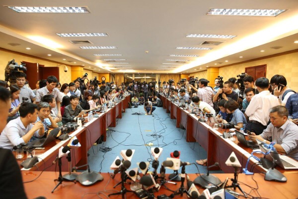 Thứ trưởng Tài nguyên và Môi trường Võ Tuấn Nhân chủ trì công bố những kết quả điều tra ban đầu, ông cũng là người kết thúc cuộc họp báo sau 7 phút giữa sự ngỡ ngàng của hàng trăm phóng viên.