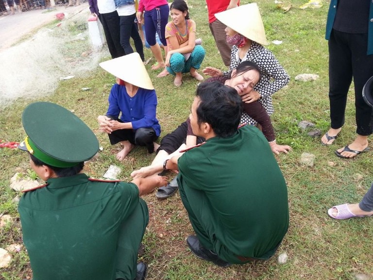 Lực lượng công an dùng bùn mén vào người dân và xô xát nhẹ khiến một vài người bị thương và bị ngất xỉu tại xã Quảng Xuân, huyện Quảng Trạch, tỉnh Hà Tĩnh vào sáng ngày 30.04.2016. Ảnh: TMCNN