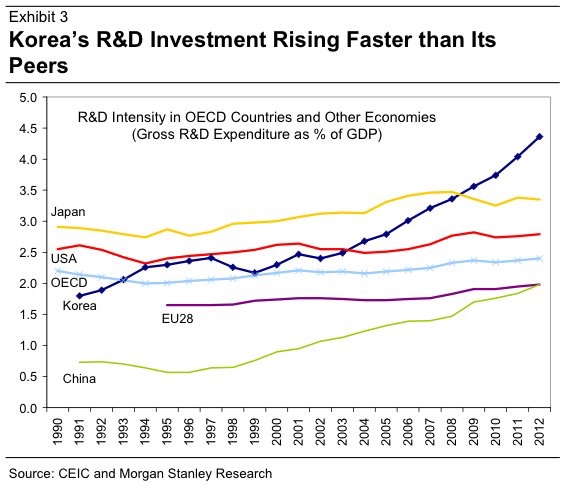 Ngân sách cho nghiên cứu và phát triển của Hàn Quốc tăng chóng mặt qua các năm (Đơn vị: % trên GDP)