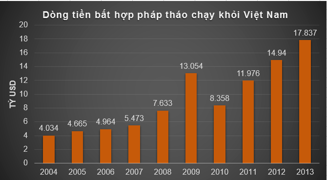 Tại thời điểm năm 2013, lượng tiền chuyển bất hợp pháp từ Việt Nam ra nước ngoài lên tới 17,837 tỷ USD, gấp hơn 4 lần lượng tiền năm 2004 là 4,034 tỷ USD.