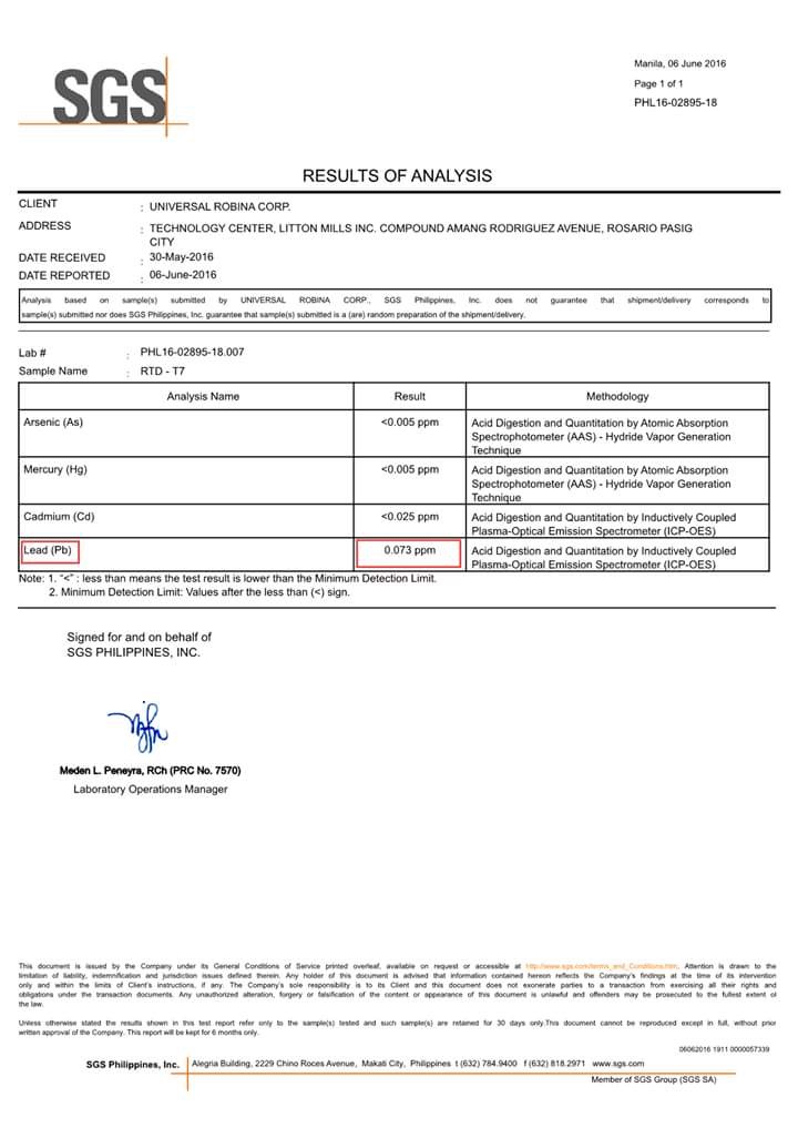 Trao đổi trên báo Chất lượng Việt Nam, đại diện của URC Việt Nam, bà Nguyễn Thiên Hương – Phụ trách truyền thông của URC cho biết URC cũng đồng thời cho kiểm tra đối chiếu tại 5 trung tâm: Quatest 1, Quatest 3, Eurofin , SGS, ASE và tất cả các kết quả đều không phát hiện hàm lượng chì. Đây lại là một lời nói dối đối với người tiêu dùng của URC!