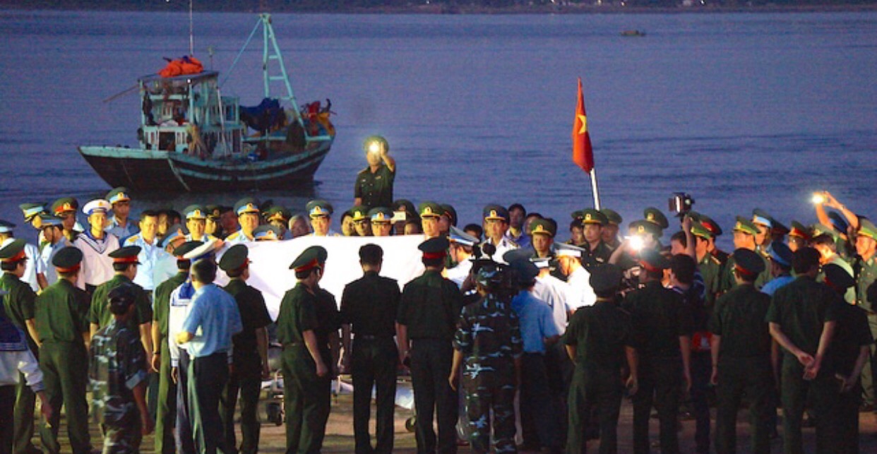 Lễ khâm liệm Thượng tá Trần Quang Khải tại cầu cảng Hải đội 2 (Cửa Hội, Cửa Lò, Nghệ An) ngày 18/6. (Ảnh: Nguyễn Duy)