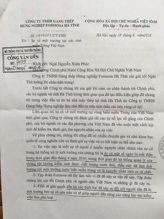 Khi thông tin cá chết đang được chờ đón theo từng giờ thì mới đây trên mạng xã hội lan tỏa mạnh một công văn được cho là của Formosa gửi cho Thủ tướng Chính phủ. Theo đó, Ban lãnh đạo Formosa Vũng Áng thừa nhận trách nhiệm của họ về nguyên nhân sự cố cá chết hàng loạt tại vùng biển 4 tỉnh Bắc Trung Bộ. Tuy nhiên, ông Trần Nguyên Thành, Chủ tịch Công ty Gang Thép Hưng Nghiệp Formosa Hà Tĩnh (FHS) đã dối trá lấp liếm sự thật khi cố tình đưa ra một lý do rằng: “Sự việc này là một sự cố ngoài ý muốn, nguyên do chính của sự cố trong hệ thống xử lý môi trường của chúng tôi là có một số ngày bị mất điện“.