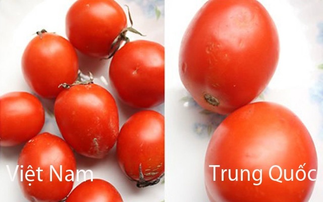 Cà chua Việt Nam (bên trái): Thường có cuống, màu sắc tươi mới hơn.