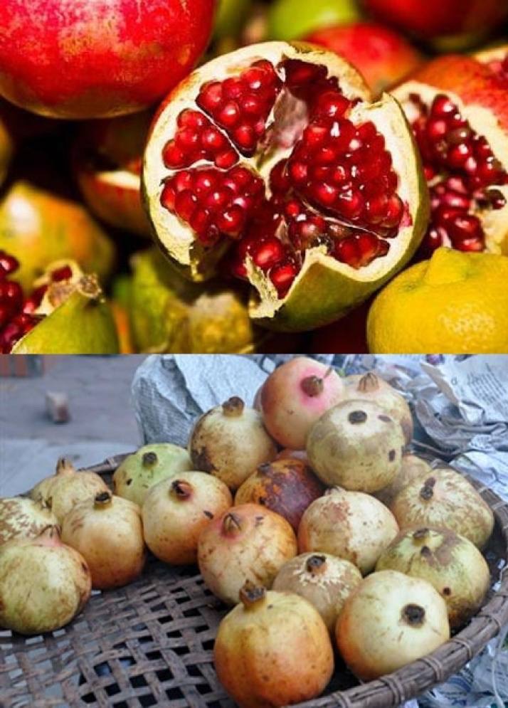 Lựu Việt Nam (ảnh trên) có kích thước nhỏ và da sần sùi so với lựu Trung Quốc (ảnh dưới).