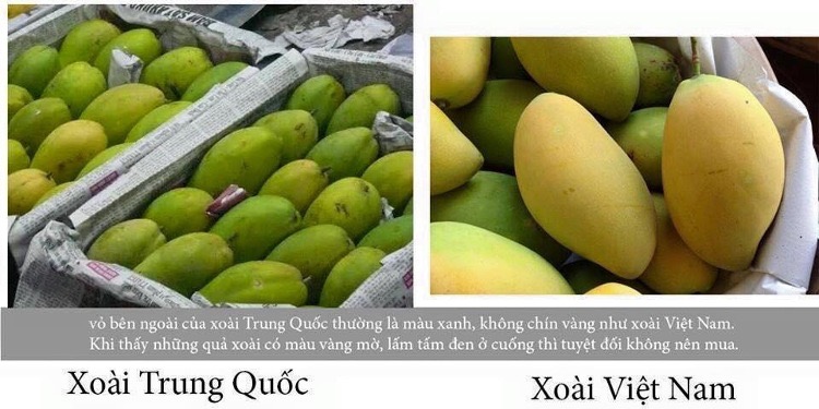 Xoài Trung Quốc có mùi hắc, vỏ có màu vàng mờ, lấm tấm đen ở cuống. Những quả xoài vỏ màu xanh nhưng bên trong lại chín vàng, không có vị xoài là xoài Trung Quốc đã được ngâm tẩm nhiều hóa chất.