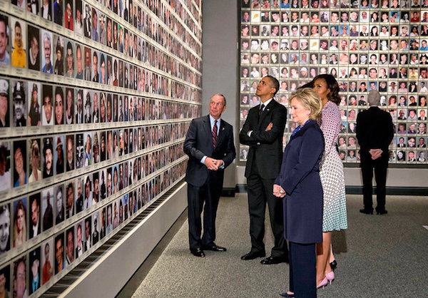 Tỷ phú Michael Bloomberg đang đứng cạnh Tổng thống Barack Obama tại Bảo tàng tưởng niệm những nạn nhân đã thiệt mạng trong vụ thảm họa sự kiện 11/9 (Ảnh: Dogecoint)