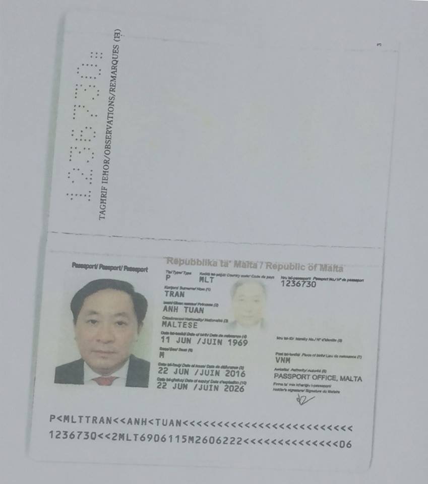 Ảnh chụp hộ chiếu ghi rõ Quốc tịch Malta của chồng bà Nguyệt Hường – ông Trần Anh Tuấn được cấp ngày 22/6/2016 bởi Văn phòng Hộ chiếu Malta. (Nguồn: FB Tuyen Nguyen Chung)