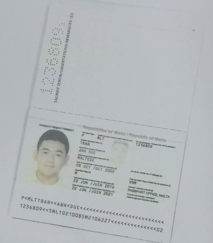 Ảnh chụp hộ chiếu ghi rõ Quốc tịch Malta của con trai bà Hường – Trần Anh Đức, được cấp ngày 22/6/2016 bởi Văn phòng Hộ chiếu Malta. (Nguồn: FB Tuyen Nguyen Chung)