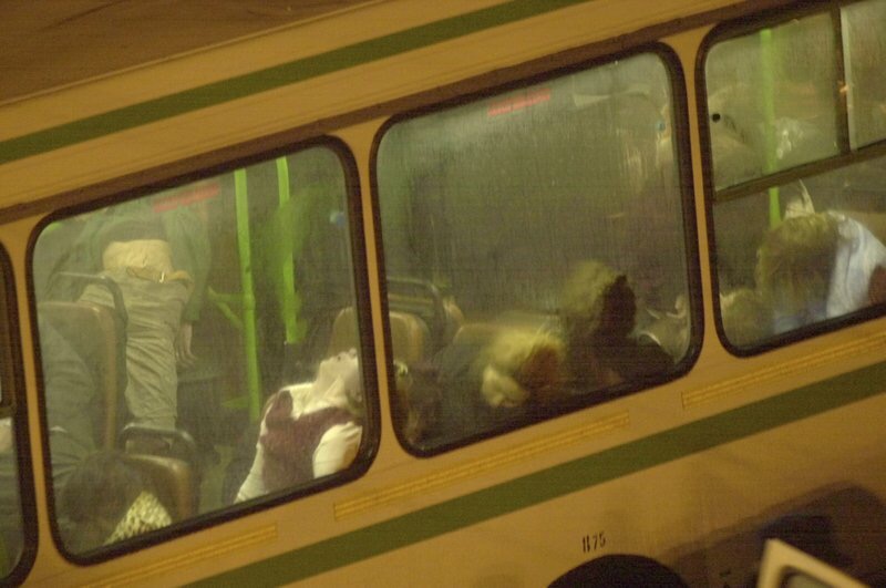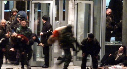 Nạn nhân vụ bắt giữ con tin tại Nhà hát Dubrovka năm 2002 nằm bất tỉnh trên một chiếc xe bus rời hiện trường. Ảnh: AP