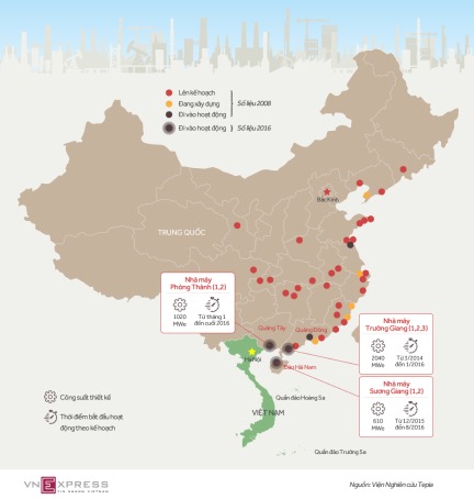 Vị trí ba nhà máy điện hạt nhân Trung Quốc gần Việt Nam. Đồ Họa: Tiến Thành.