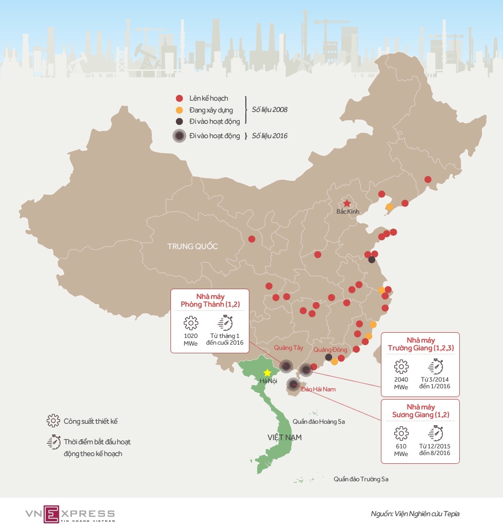 Ba nhà máy điện hạt nhân ở phía nam Trung Quốc vừa đi vào vận hành thương mại. Trong đó nhà máy Phòng Thành cách Quảng Ninh 50 km; nhà máy Sương Giang cách đảo Bạch Long Vĩ khoảng 100 km và nhà máy Trường Giang cách biên giới Việt Nam hơn 200 km.