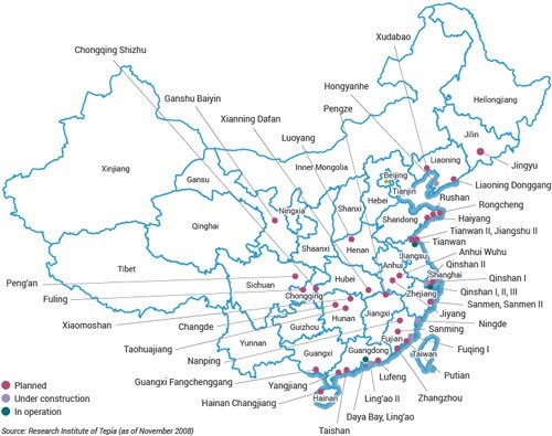Kế hoạch xây dựng nhà máy điện hạt nhân của Trung Quốc, nhà máy đang hoạt động (màu xanh lá cây), đang xây dựng (xanh lam) và trong kế hoạch (đỏ). Nguồn: world-nuclear.org
