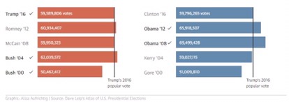 Bà Clinton đã thắng về số phiếu bầu phổ thông năm nay. Nhưng thậm chí ứng cử viên Mitt Romney thua cuộc trong năm 2012 vẫn có nhiều phiếu bầu hơn người chiến thắng năm 2016. Cả Clinton và Trump đều có số phiếu bầu thấp hơn ông Obama năm 2012 và 2008.