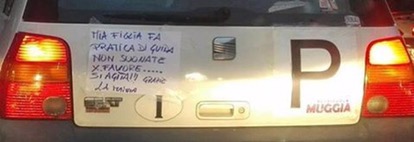 Mấy hôm nay, hàng nghìn người Ý đã chia sẻ trên mạng xã hội tấm ảnh này. Một bà mẹ đã dán lên phía sau xe của con gái mình một tờ giấy, viết ngắn gọn thế này: “Con gái tôi mới lái xe. Làm ơn đừng bóp còi nó, kẻo nó cuống. Cám ơn”. Kí tên: “Mẹ”. Đằng sau chiếc xe còn có một tờ giấy ghi chữ “P” (mới lái) mà rất nhiều người mới có bằng hoặc mới tập lái ở Ý dán vào sau xe.