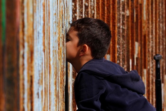 Cậu bé nói chuyện với họ hàng qua hàng rào ngăn cách ở khu vực biên giới Mỹ và Mexico ở thành phố Tijuana, Mexico.