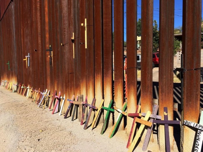 Bộ thánh giá bằng gỗ tưởng nhớ những người thiệt mạng trên đường di cư đến Mỹ được đặt tại biên giới Mexico – Mỹ ở Nogales, bang Sonora, Mexico.