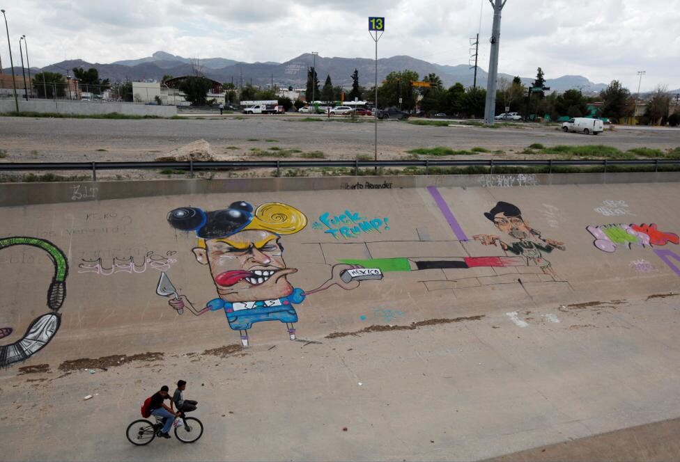 Bức tường vẽ phong cách graffiti châm biếm ông Donald Trump dọc theo biên giới phía bắc của Mexico với Mỹ tại Ciudad Juarez.