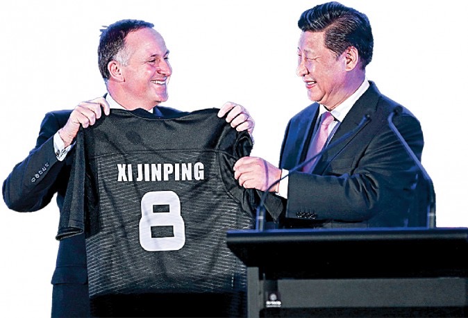 Cựu Thủ tướng New Zealand John Key tặng một chiếc áo bóng bầu dục cho Chủ tịch Trung Quốc Tập Cận Bình ở Wellington, New Zealand, vào ngày 20 tháng 11 năm 2014. Trung Quốc đã trở thành khách hàng lớn nhất mua lại đất nông nghiệp ở New Zealand, và [tập đoàn] Bằng Hân Thượng Hải (Shanhai Pengxin) hiện là Nhà sản xuất sữa lớn thứ ba tại New Zealand (Ảnh: Hagen Hopkins /Getty Images)