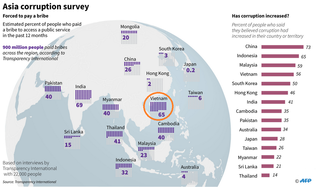 Một khảo sát của Tổ chức Minh bạch Quốc tế nói rằng cứ 100 người Việt thì có 65 người đưa hối lộ trong những dịch vụ công như trường học, bệnh viện, thủ tục hành chính, cảnh sát và tòa án.