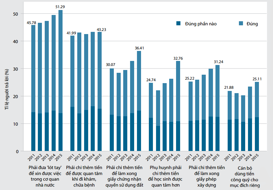 Tỉ lệ người trả lời đánh giá tình trạng tham nhũng đang gia tăng, gia tăng mạnh nhất trong năm 2015 là tỉ lệ phụ huynh phải “bồi dưỡng” ngoài quy định cho thầy cô giáo và “lót tay” tại bệnh viện công để được chăm sóc tốt hơn.