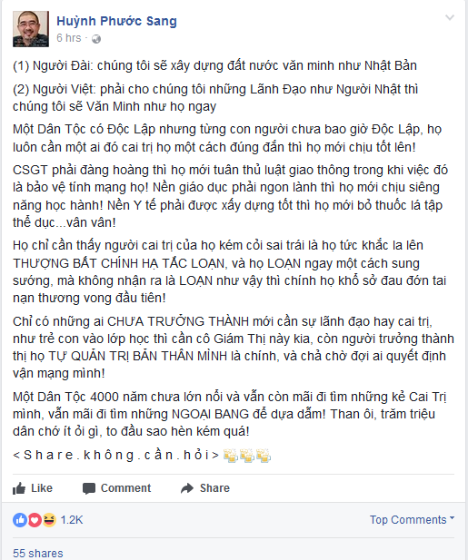 Đó là vì sao Đài Loan và người Đài Loan phát triển và văn minh hơn Việt Nam. Dân Việt Nam qua Đài Loan để làm thuê, còn dân Đài Loan qua Việt Nam để làm chủ. Một dân tộc mà bị cai trị bởi lãnh đạo ngu thì mãi không phát triển nổi. Một bày sói mà bị dẫn dắt bởi con cừu thì sẽ bị “cừu hóa.” Có như vậy mà không hiểu, ôi cái anh bác sĩ tài ba của tôi. SHARE KHÔNG CẦN HỎI.