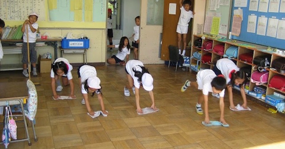 Ở Nhật – họ coi việc học sinh thực hành làm vệ sinh trường lớp là một họat động quan trọng và chính thức. Các nhà giáo dục, thầy cô luôn tổ chức và đảm bảo việc này được thực hiên nghiêm chỉnh, giá trị và đầy đủ.
