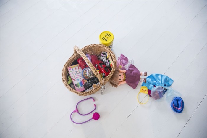 Khi bé Ei muốn chơi đồ chơi, em sẽ không đi đến phòng chơi và cũng chẳng cần góc chơi nào trong căn hộ. Thay vào đó, cô bé nhận được một chiếc giỏ nhỏ chứa tất cả tài sản quý báu nhất của mình – một con búp bê, một con Thỏ Minions với một số xe hơi, một đồ chơi yoyo… và chơi ngay trên sàn gỗ trắng sạch sẽ trong căn hộ của mình.