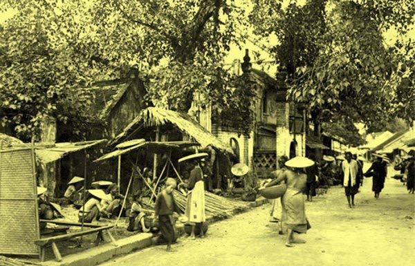 Hà Nội không có chợ mái che, cũng không có nơi quy định để họp chợ. Cả thành phố biến thành cái chợ mênh mông ở ngoài trời. Vào ngày phiên, lái buôn và thợ thủ công đủ các loại từ các làng mạc xung quanh kéo tới. Những người bán tơ lụa tới phố Hàng Đào, những người làm cuốc xẻng tới phố Hàng Đồng, những người làm nón đến phố Hàng Nón, tóm lại, thợ gì thì tới phố dành cho thợ ấy. Người ta đi lại, dạo chơi, chuyện trò, râm ran tiếng nói của số người gấp đôi ngày thường vốn đã đông như kiến. Việc họp chợ chẳng tốn kém gì, chỉ cần thời tiết tốt. Những người nông dân bày bán sản phẩm của mình trong chiếc túi vải hoặc trong rổ, hoặc ngay trên mặt đất nếu hàng không sợ hư hỏng. Mặt phố tràn ngập người.