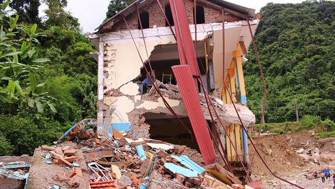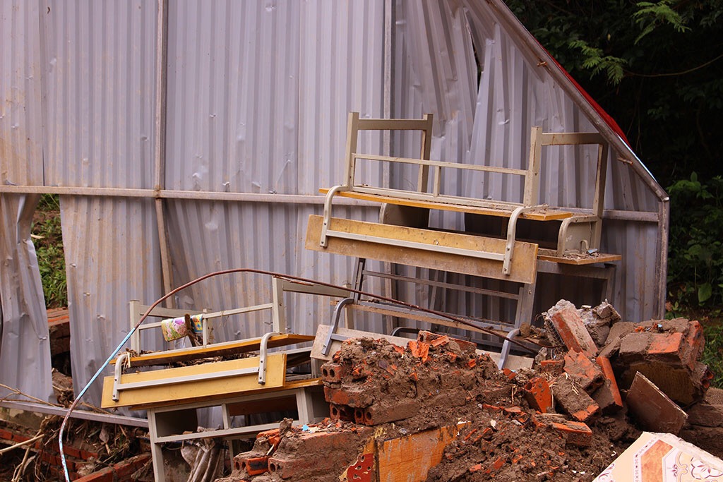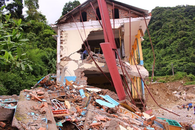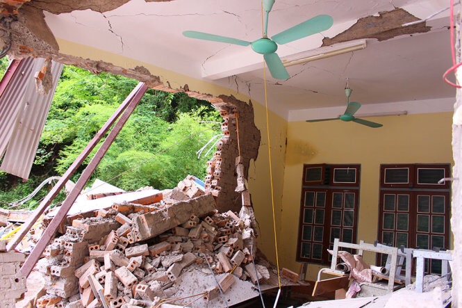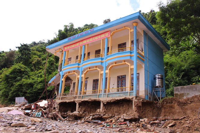 Điểm trường tiểu học ở bản Piệng, xã Nặm Păm, huyện Mường La (tỉnh Sơn La), sau trận lũ kinh hoàng đêm 2-8, hầu như là một đống đổ nát vương vãi sách vở, bàn ghế. Chỉ còn lại 4 phòng học, nằm choi loi hỗng chân móng, có thể đổ sập bất cứ lúc nào.
