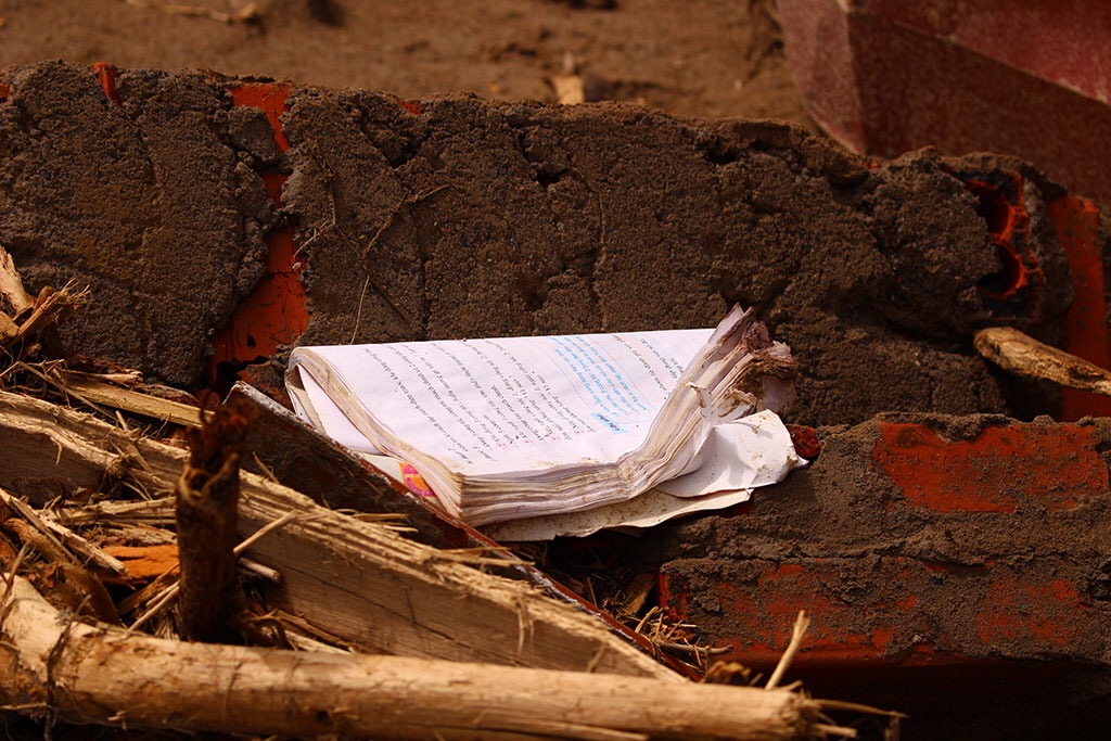 Trong đống đổ nát, vẫn còn vương vãi sách vở của học sinh – Ảnh: HÀ THANH