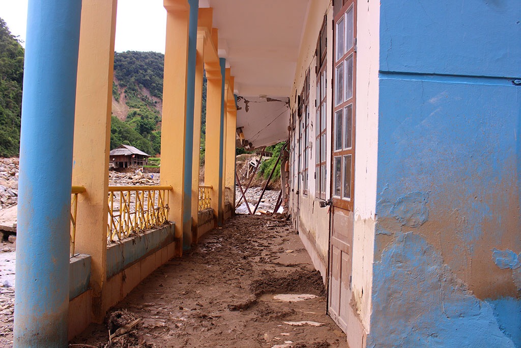 Trường tiểu học xã Nặm Păm bị lũ cuốn trôi, chỉ còn trơ lại 4 phòng học – Ảnh: HÀ THANH
