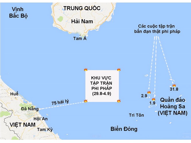 NĂM 2017 – QUỐC KHÁNH VIỆT NAM – Trung quốc đưa quân vào tập trận bắn đạn thật (28/8 – 4/9/2017) tại Vùng Đặc quyền Kinh tế của Việt Nam, cách Đà Nẵng 75 hải lý, cấm tầu bè của ta trong một vùng biển hơn 11000 Km2.