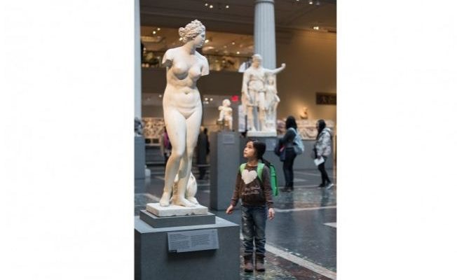 Một bé gái ngắm nhìn bức tượng La Mã, một phụ nữ Amazon cụt tay tại Bảo tàng Nghệ thuật Metropolitan ở New York, ngày 29 tháng 12 năm 2016. (Samira Bouaou / Epoch Times)