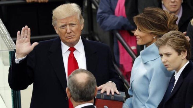 Tổng thống Donald Trump trong lễ tuyên thệ nhậm chức.Bài phát biểu nhân ngày độc lập Tổng thống đã nhấn mạnh: “Ở Mỹ, chúng ta không tôn kính chính phủ, chúng ta tôn kính Chúa”. Ảnh dẫn theo todayonline.com