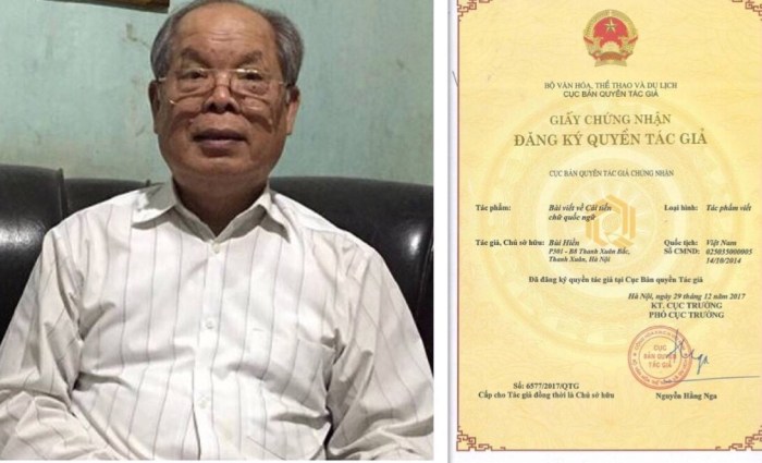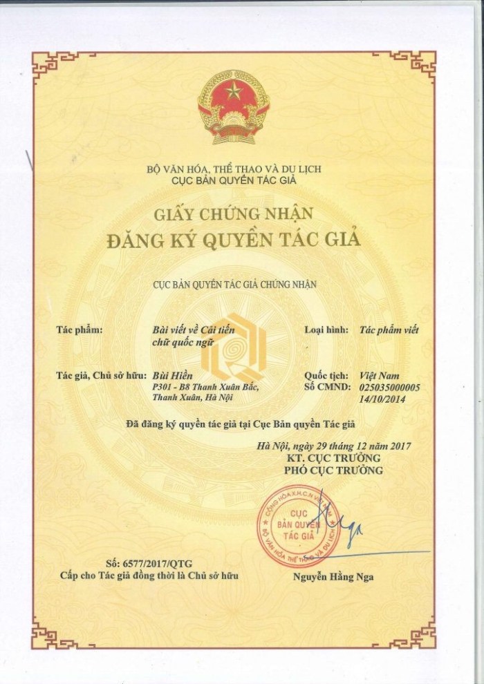 Giấy chứng nhận này viết “Cục Bản quyền tác giả chứng nhận tác phẩm Bài viết về cải tiến chữ quốc ngữ, loại hình: tác phẩm viết, tác giả, chủ sở hữu Bùi Hiền đã đăng ký quyền tác giả tại Cục Bản quyền tác giả”.