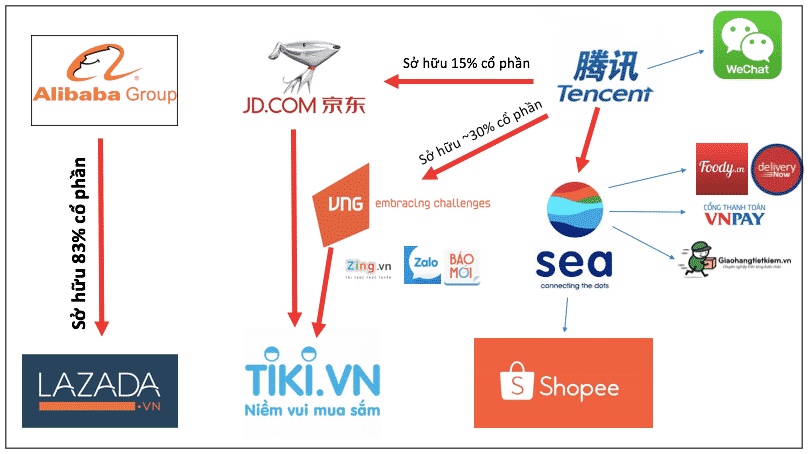 Ngoài ra, Tencent còn nắm trong tay 15% cổ phần của JD.com. Không chỉ vậy, một trong hai công ty Việt Nam mà Tencent đầu tư với cổ phần không nhỏ là VNG cũng chính là một trong 3 cổ đông lớn nhất của Tiki. VNG đã mua 38% cổ phần Tiki với giá 384 tỉ đồng hồi năm 2016 và là một trong ba nhà đầu tư bỏ vốn 1.300 tỷ vào Tiki hồi tháng 12/2017.