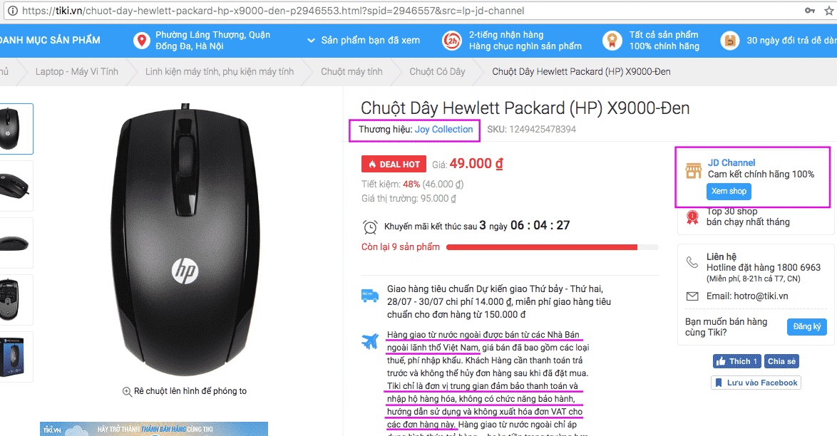 Phần ghi chú có đoạn: Hàng giao từ nước ngoài được bán từ các nhà bán ngoài lãnh thổ Việt Nam. Tiki chỉ là đơn vị trung gian đảm bảo thanh toán và nhập hộ hàng hoá, không có chức năng bảo hành, hướng dẫn sử dụng và không xuất hoá đơn VAT cho các đơn hàng này.