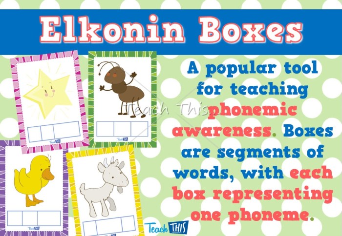 Elkonin Boxes là một công cụ phổ biến cho việc giảng dạy nhận thức ngữ âm. Các hộp Elkonin là các phân đoạn của các từ, với mỗi hộp đại diện cho một âm vị.