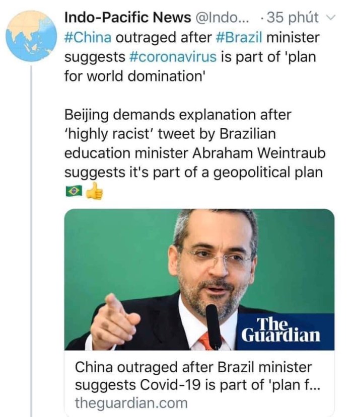 Trung Quốc đã yêu cầu một lời giải thích từ Brazil, sau khi bộ trưởng giáo dục của nước này nói Bắc Kinh lên kế hoạch cho đại dịch coronavirus với mục đích thống trị thế giới của Trung Quốc, trong một tweet bắt chước giọng Trung Quốc.
