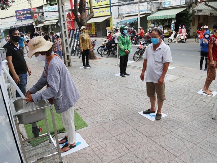 Người dân đến nhận gạo được sắp xếp đứng cách nhau 2 m theo quy định. Ảnh: HOÀNG GIANG