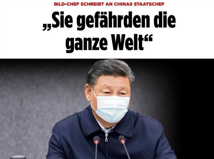Với tiêu đề „Ông làm tổn hại cả thế giới“, ngày 16.04.2020, Báo „BILD“ đã đăng bức thư của Tổng biên tập Julian Reichelt gửi Chủ tịch Tập Cận Bình. Dưới đây là bản dịch bức thư.