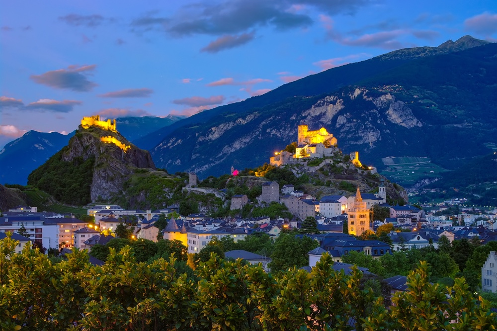 Các tòa tháp cao của Castle Tourbillon và Castle of Valeria đứng sừng sững như hàng thế kỷ trên hai mỏm đá nằm bên trái và phải của chúng bởi độ cao bao la của dãy Bernese Alps.