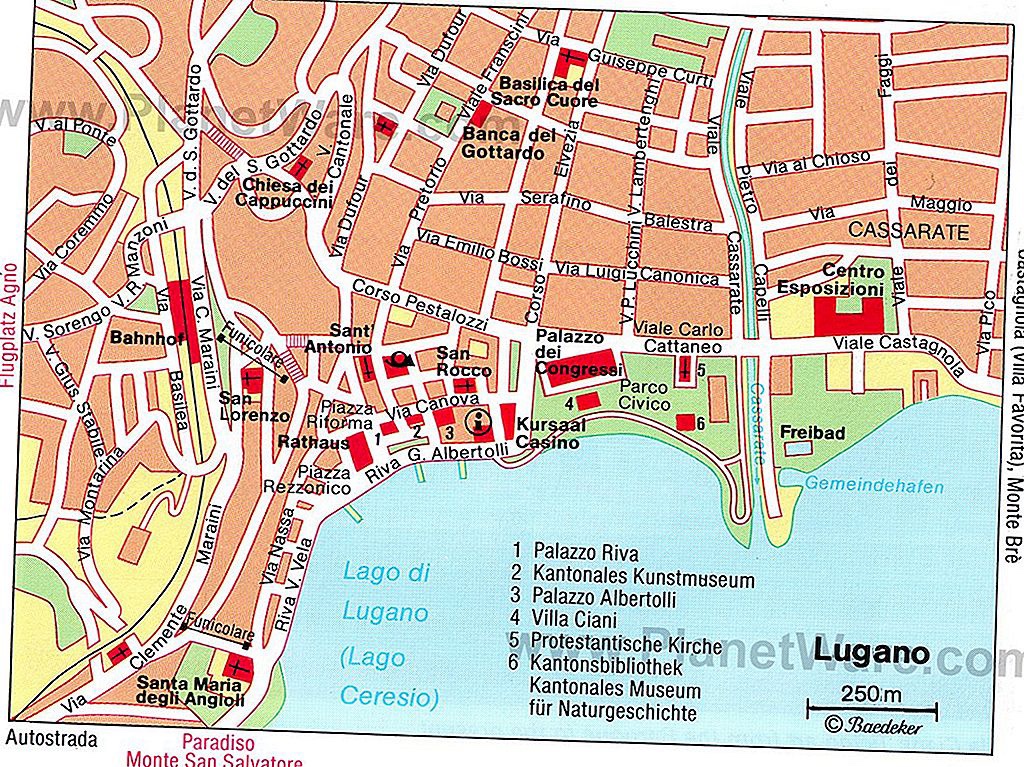 Các vị trí khách sạn tốt nhất ở Lugano gần hồ và lối đi dạo dọc theo bờ biển của nó. Ở một đầu là Paradiso, nơi đường sắt leo núi bắt đầu cho Monte San Salvatore, và ở đầu kia là khu vực Cassarate, với đường sắt leo núi lên Monte Bre. Khoảng giữa đường là phố mua sắm chính, Via Nessa, và một loạt các con đường nhỏ hơn leo dốc đến nhà thờ và ga tàu. Những khách sạn được xếp hạng cao ở Lugano rất thuận tiện để tham quan: