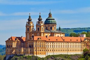 Tu viện Melk là một trong những địa điểm tu viện nổi tiếng nhất thế giới và các tòa nhà ngoạn mục của nó được bố trí xung quanh bảy sân trong. Phần nổi bật nhất của khu phức hợp đồ sộ dài 325 mét này là đầu phía tây và nhà thờ tháp đôi của nó vươn lên trên dãy sân hiên hình bán nguyệt.