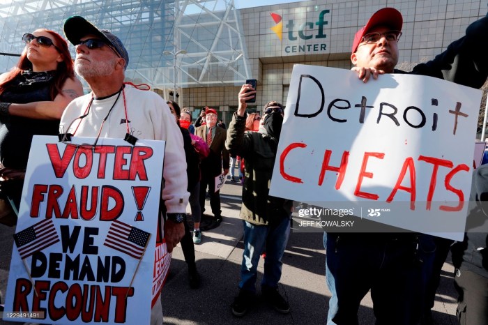 Ngày 6/11/2020, người Mỹ biểu tình chống lại gian lận kiểm phiếu trong cuộc bầu cử năm 2020 ở Detroit, Michigan. (Ảnh: JEFF KOWALSKY/AFP/Getty Images)