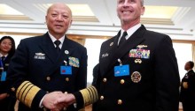 Mọi thông tin về việc Trung Quốc xây dựng, bồi lấp, quân sự hóa phi pháp ở Trường Sa từ khi bắt đầu cho đến nay đều do Mỹ “độc quyền” công bố… Tư lệnh Hải quân Trung Quốc Ngô Thắng Lợi và Tham mưu trưởng Hải quân Hoa Kỳ Jonathan Greenert. Ảnh: The…